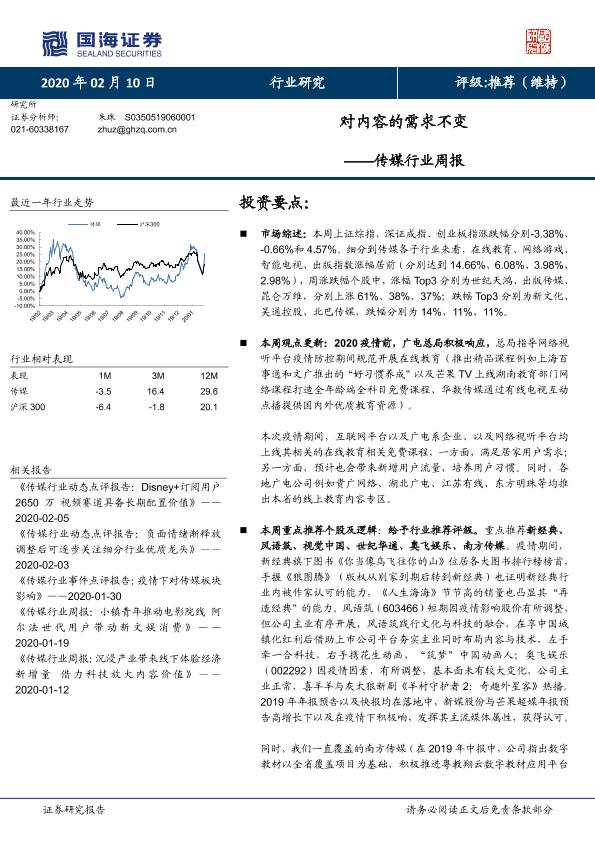 传媒行业 内容需求 在线教育 疫情响应 股票分析
