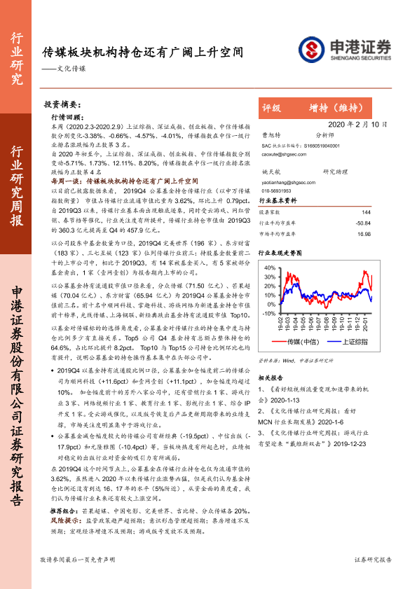 【申港证券】【20200210】20200210-申港证券-文化传媒行业研究周报:传媒板块机构持仓还有广阔上升空间-17页