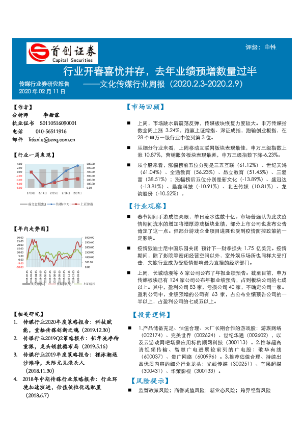 【首创证券】【20200211】20200211-首创证券-文化传媒行业周报:行业开春喜忧并存,去年业绩预增数量过半-14页