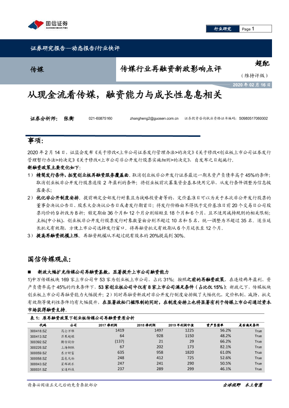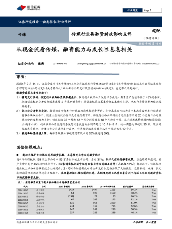 【国信证券】【20200216】传媒行业再融资新政影响点评:从现金流看传媒,融资能力与成长性息息相关-7页