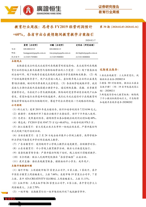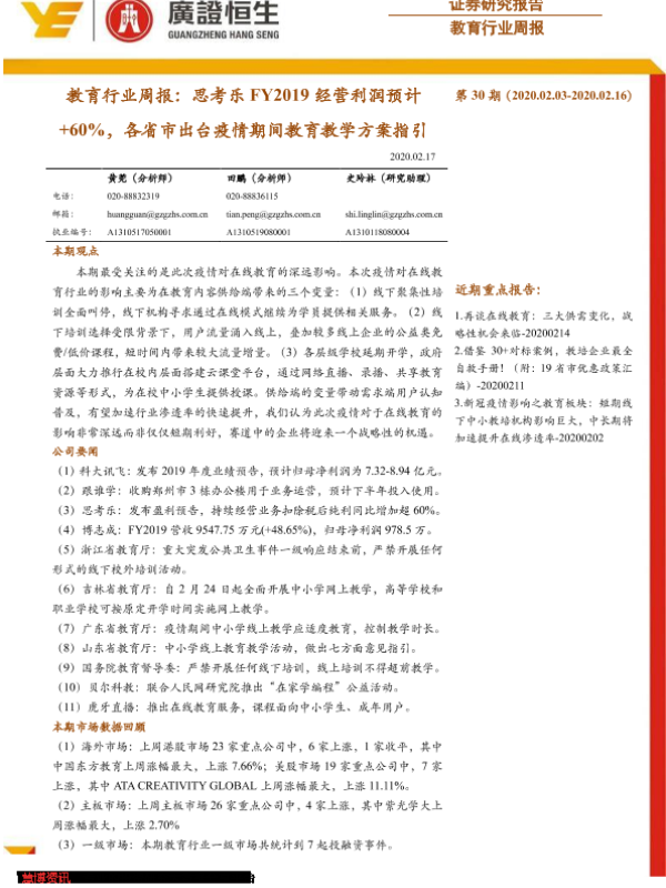 【广证恒生】【20200217】教育行业周报:思考乐FY2019经营利润预计+60%,各省市出台疫情期间教育教学方案指引-11页