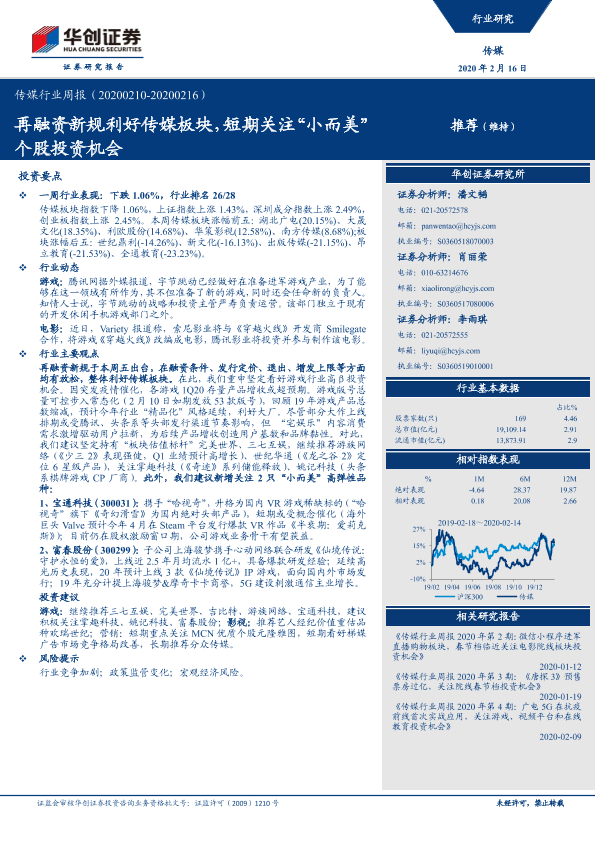 【华创证券】【20200216】20200216-华创证券-传媒行业周报:再融资新规利好传媒板块,短期关注“小而美”个股投资机会-15页