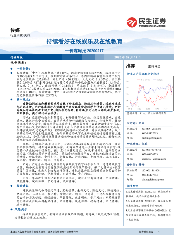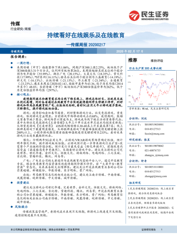 【民生证券】【20200217】持续看好在线娱乐及在线教育—传媒周报 20200217-16页