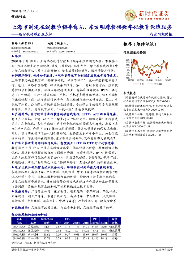 【新时代证券】【20200218】新时代传媒行业点评:上海市制定在线教学指导意见,东方明珠提供数字化教育保障服务-4页
