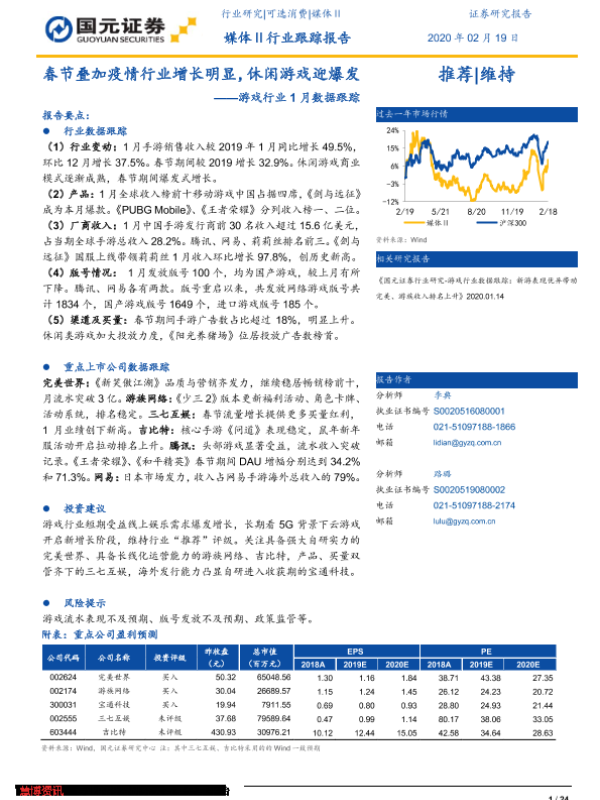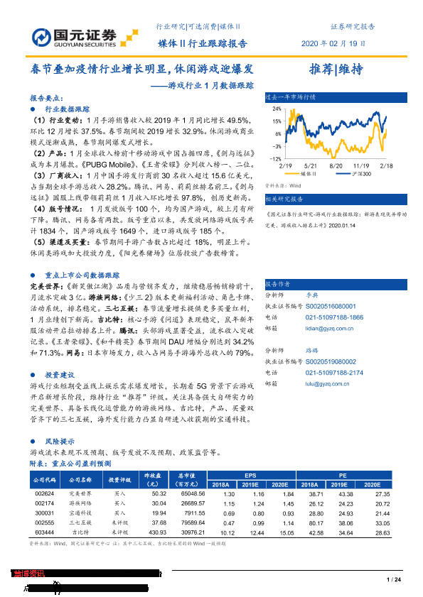 【国元证券】【20200219】游戏行业1月数据跟踪:春节叠加疫情行业增长明显,休闲游戏迎爆发-24页