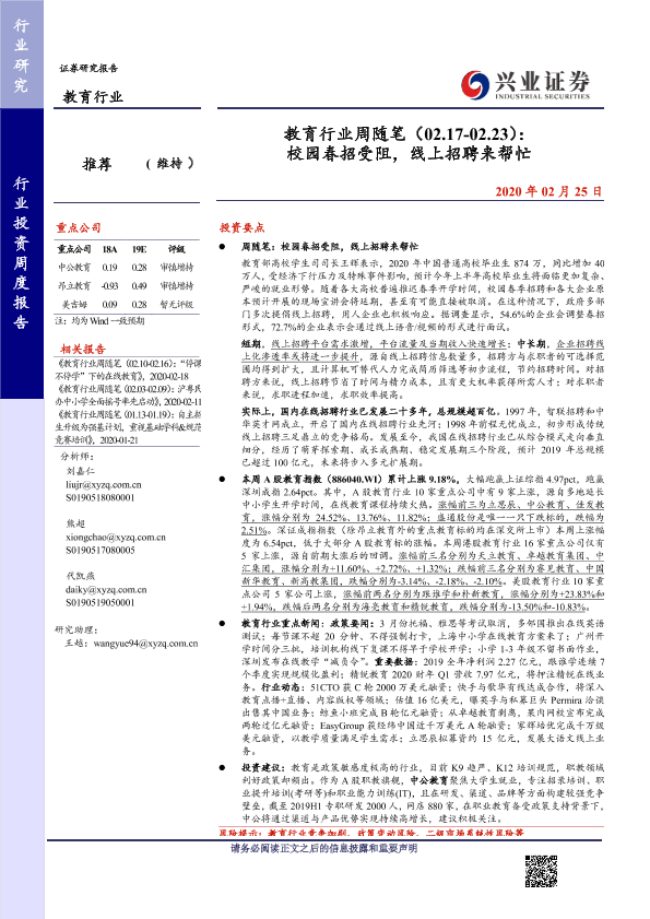 【兴业证券】【20200225】教育行业周随笔(02.17-02.23): 校园春招受阻,线上招聘来帮忙-14页