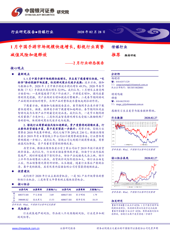 【银河证券】【20200228】2月行业动态报告:1月中国手游市场规模快速增长,影视行业商誉减值风险加速释放-45页