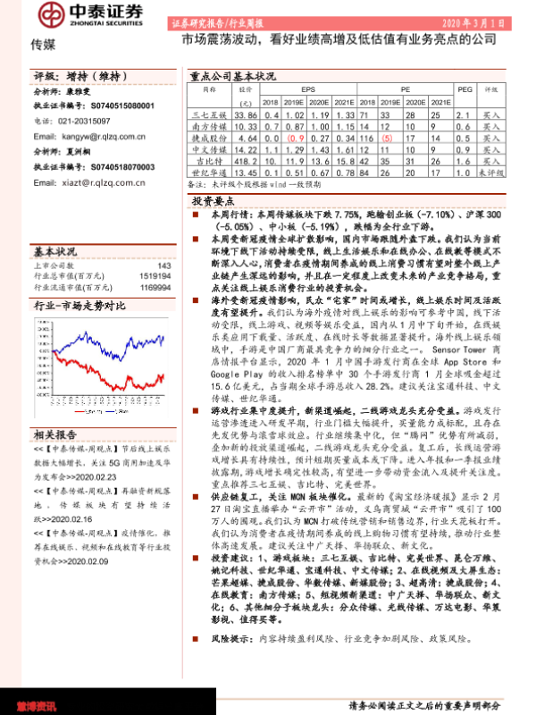 【中泰证券】【20200301】20200301-中泰证券-传媒行业周报:市场震荡波动,看好业绩高增及低估值有业务亮点的公司-10页