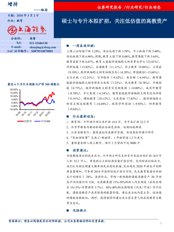 【上海证券】【20200302】20200302-上海证券-教育行业动态:硕士与专升本拟扩招,关注低估值的高教资产-9页