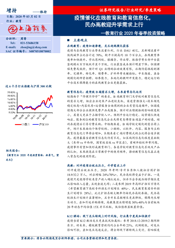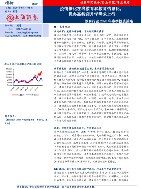【上海证券】【20200302】教育行业2020年春季投资策略:疫情催化在线教育和教育信息化,民办高教迎升学需求上行-20页
