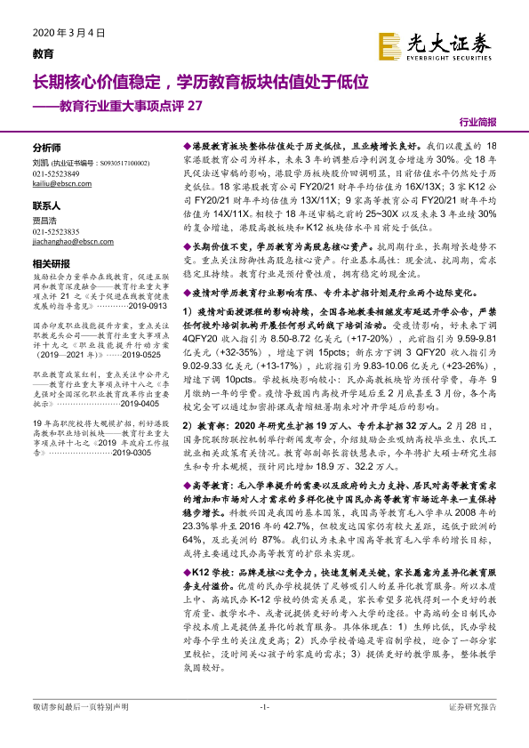 【光大证券】【20200304】20200304-光大证券-教育行业重大事项点评27:长期核心价值稳定,学历教育板块估值处于低位-5页