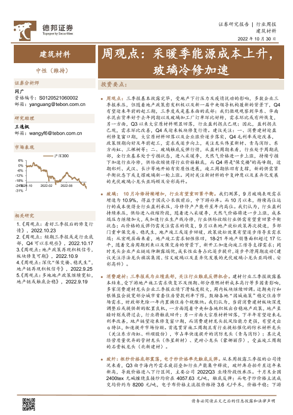 【德邦证券】【20221030】建筑材料周观点:采暖季能源成本上升,玻璃冷修加速-21页