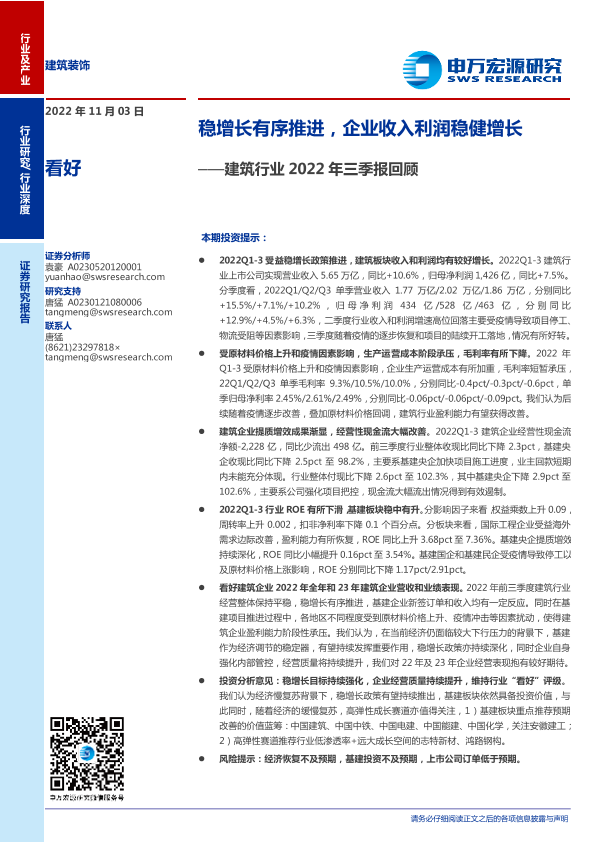 【申万宏源】【20221103】建筑行业2022年三季报回顾:稳增长有序推进,企业收入利润稳健增长-20页