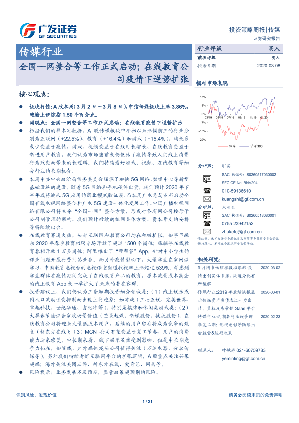 【广发证券】【20200308】20200308-广发证券-传媒行业投资策略周报:全国一网整合等工作正式启动;在线教育公司疫情下逆势扩张-21页