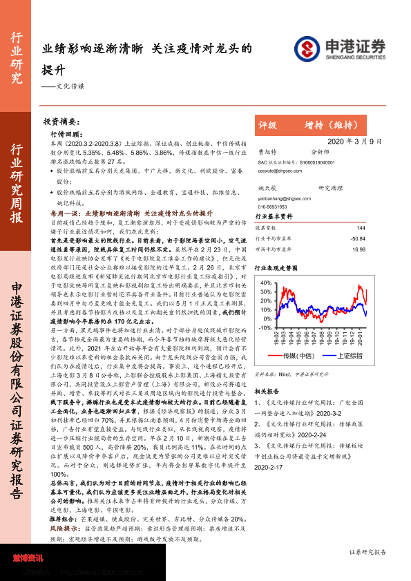 【申港证券】【20200309】20200309-申港证券-文化传媒行业研究周报:业绩影响逐渐清晰关注疫情对龙头的提升-17页
