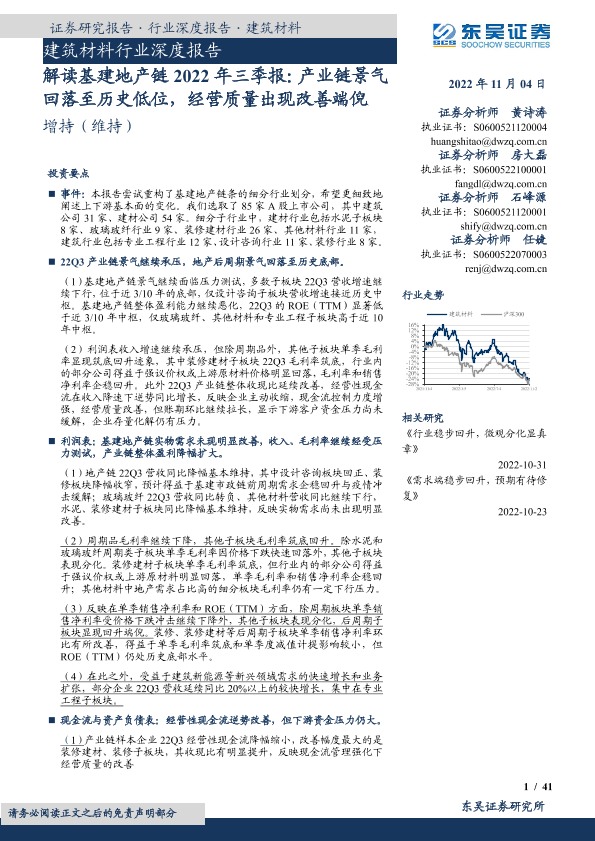 【东吴证券】【20221104】建筑材料行业深度报告:解读基建地产链2022年三季报:产业链景气回落至历史低位,经营质量出现改善端倪-41页
