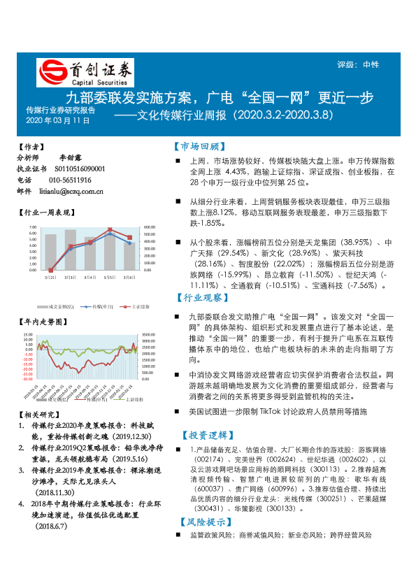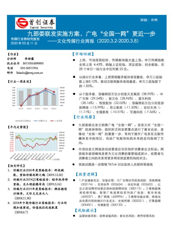 【首创证券】【20200311】20200311-首创证券-文化传媒行业周报:九部委联发实施方案,广电“全国一网”更近一步-12页