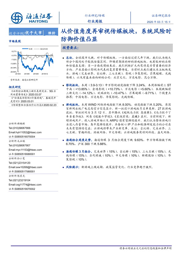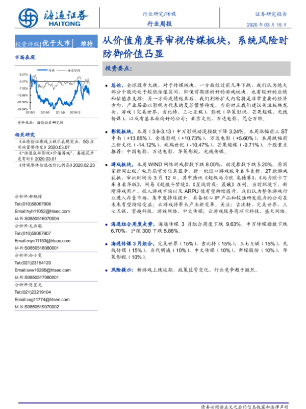 【海通证券】【20200315】20200315-海通证券-传媒行业周报:从价值角度再审视传媒板块,系统风险时防御价值凸显-8页