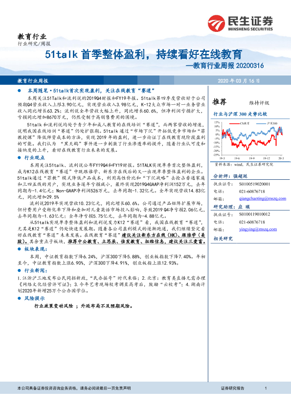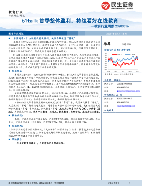 【民生证券】【20200316】20200316-民生证券-教育行业周报:51talk首季整体盈利,持续看好在线教育-13页