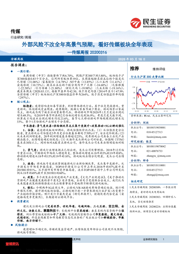 【民生证券】【20200316】20200316-民生证券-传媒周报:外部风险不改全年高景气预期,看好传媒板块全年表现-17页
