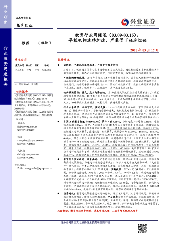 【兴业证券】【20200317】教育行业周随笔(03.09-03.15):早教机构洗牌加速,严监管下强者恒强-15页
