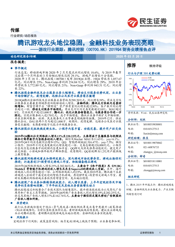 【民生证券】【20200320】游戏行业跟踪:腾讯控股2019Q4财务业绩报告点评:腾讯游戏龙头地位稳固,金融科技业务表现亮眼-21页