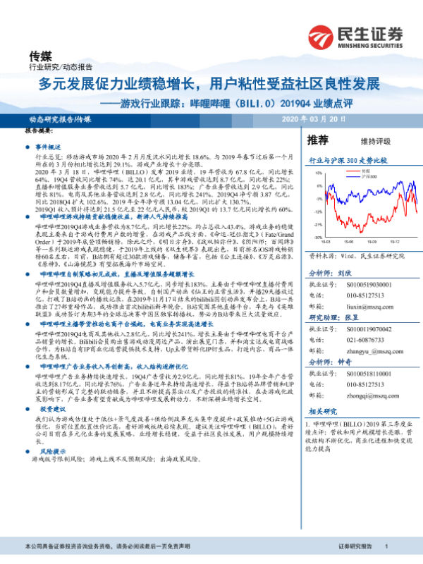 【民生证券】【20200320】20200320-民生证券-游戏行业跟踪:哔哩哔哩(BILI.O)2019Q4业绩点评:多元发展促力业绩稳增长,用户粘性受益社区良性发展-10页