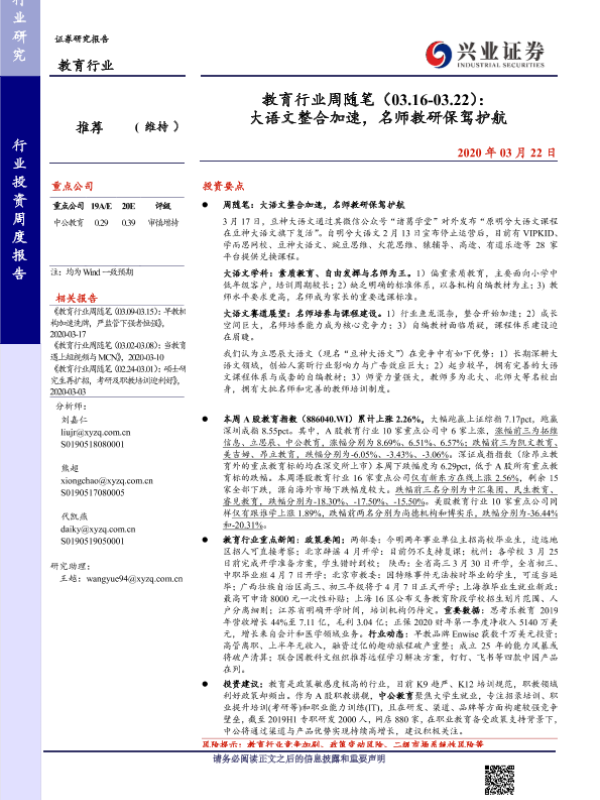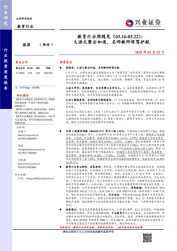 【兴业证券】【20200322】教育行业周随笔(03.16-03.22):大语文整合加速,名师教研保驾护航-16页