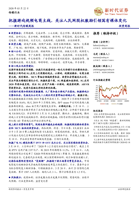 【新时代证券】【20200322】新时代传媒周报:把握游戏视频电商主线,关注人民网股权激励引领国有媒体变化-32页