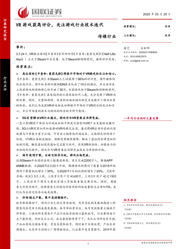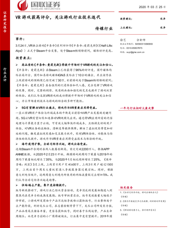 【国联证券】【20200325】传媒行业:VR游戏获高评分,关注游戏行业技术迭代-4页