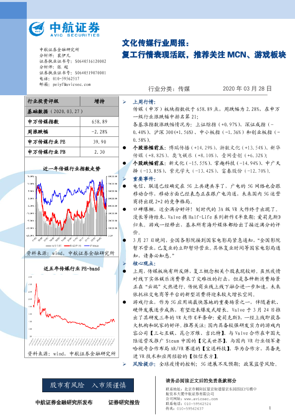 【中航证券】【20200328】20200328-中航证券-文化传媒行业周报:复工行情表现活跃,推荐关注MCN、游戏板块-10页