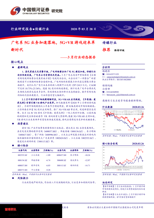 【银河证券】【20200328】传媒行业3月行业动态报告:广电系5G业务加速落地,5G+VR游戏迎来革新时代-45页