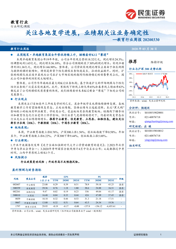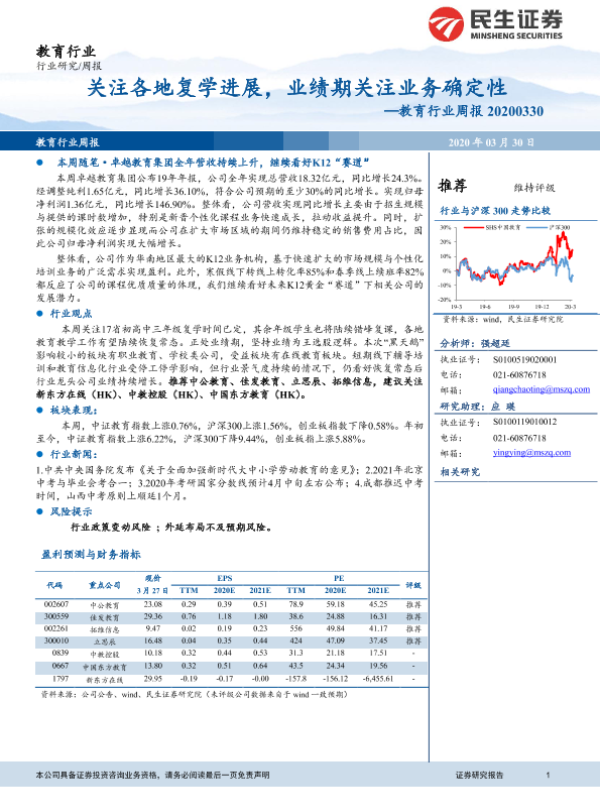 【民生证券】【20200330】教育行业周报:关注各地复学进展,业绩期关注业务确定性-12页
