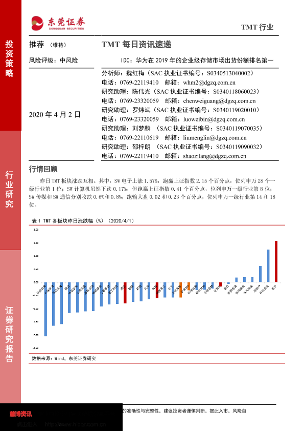【东莞证券】【20200402】20200402-东莞证券-TMT每日资讯速递:IDC:华为在2019年的企业级存储市场出货份额排名第一-4页