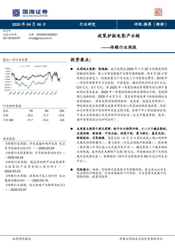 传媒行业 政策支持 电影产业链 疫情影响 院线