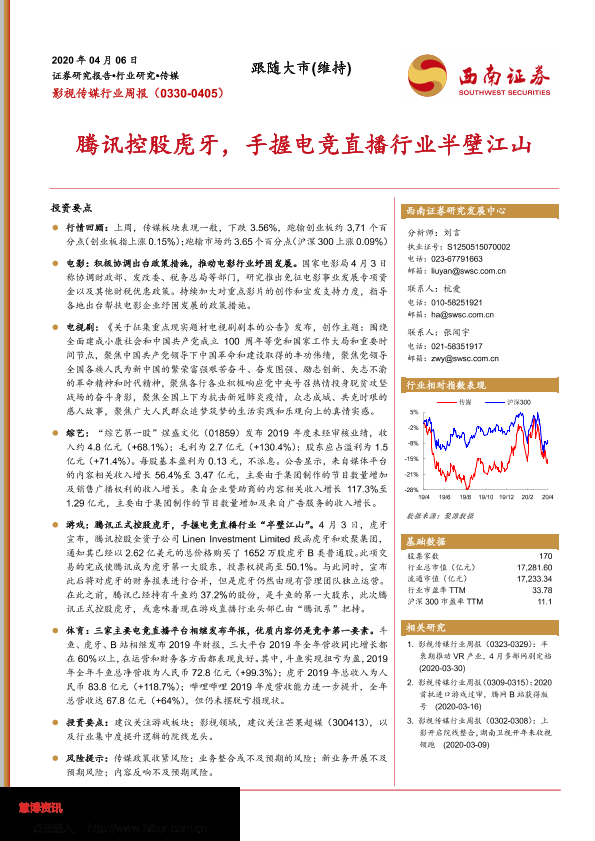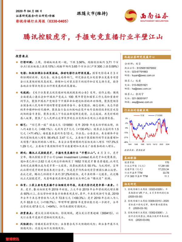【西南证券】【20200406】20200406-西南证券-影视传媒行业周报:腾讯控股虎牙,手握电竞直播行业半壁江山-16页