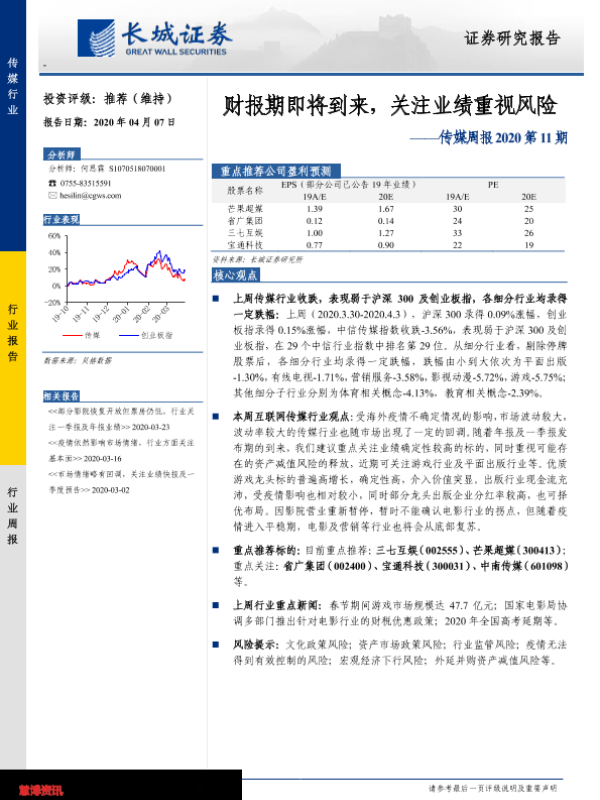 【长城证券】【20200407】20200407-长城证券-传媒周报2020第11期:财报期即将到来,关注业绩重视风险-16页