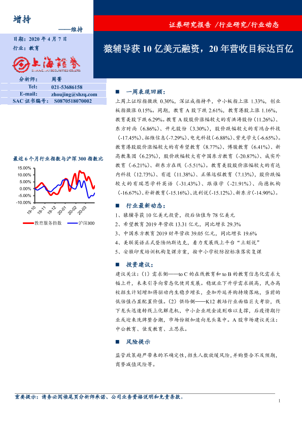 【上海证券】【20200407】20200407-上海证券-教育行业动态:猿辅导获10亿美元融资,20年营收目标达百亿-8页