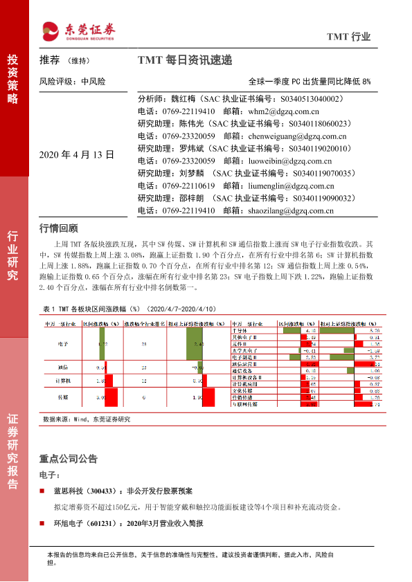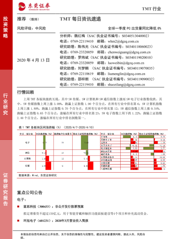 【东莞证券】【20200413】20200413-东莞证券-TMT每日资讯速递:全球一季度PC出货量同比降低8%-3页