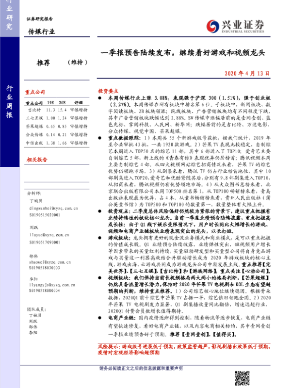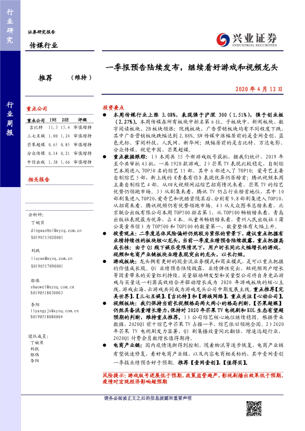 【兴业证券】【20200413】20200413-兴业证券-传媒行业周报:一季报预告陆续发布,继续看好游戏和视频龙头-18页