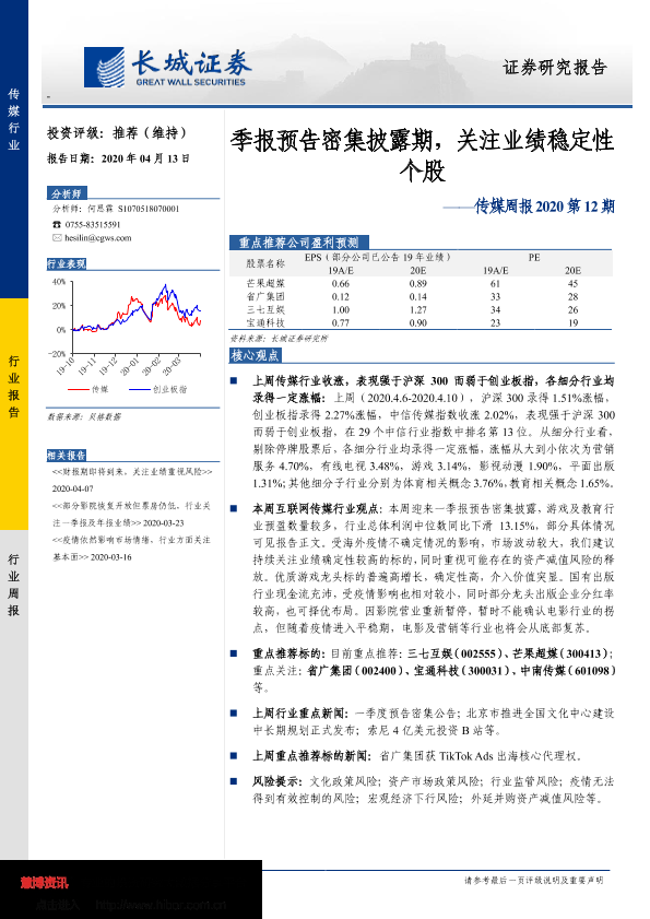 【长城证券】【20200413】传媒周报2020第12期:季报预告密集披露期,关注业绩稳定性个股-18页
