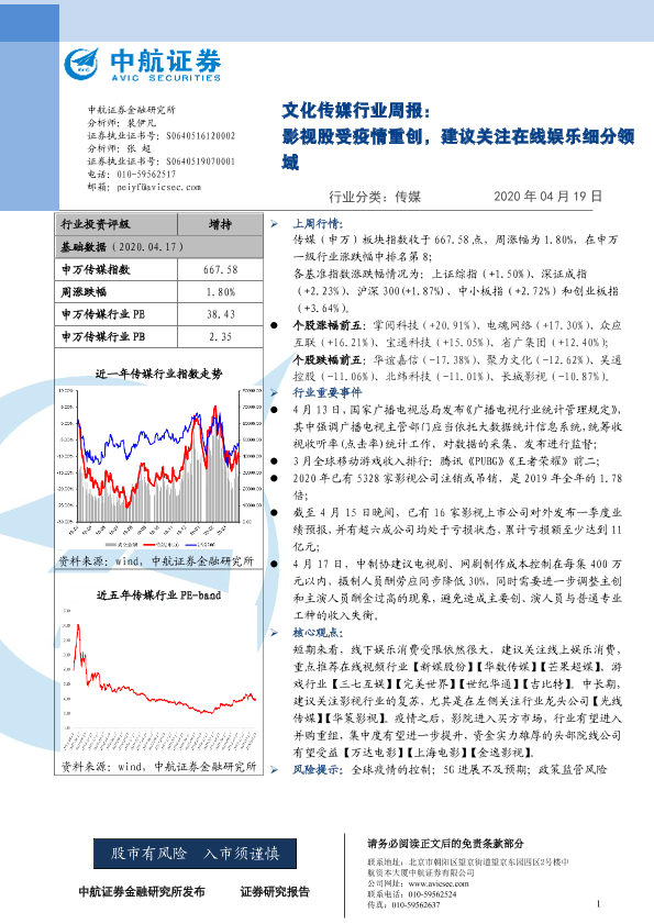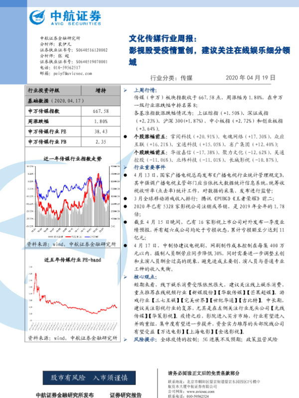 【中航证券】【20200419】20200419-中航证券-文化传媒行业周报:影视股受疫情重创,建议关注在线娱乐细分领域-7页