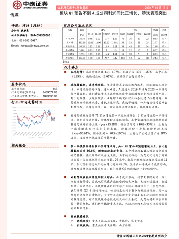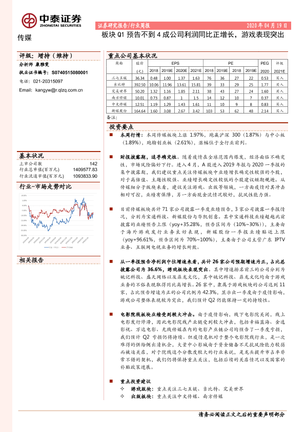 【中泰证券】【20200419】传媒行业周报:板块Q1预告不到4成公司利润同比正增长,游戏表现突出-13页