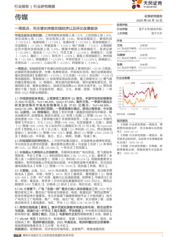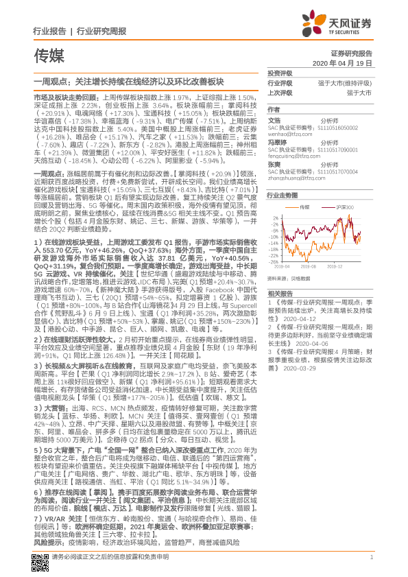 【天风证券】【20200419】20200419-天风证券-传媒一周观点:关注增长持续在线经济以及环比改善板块-24页