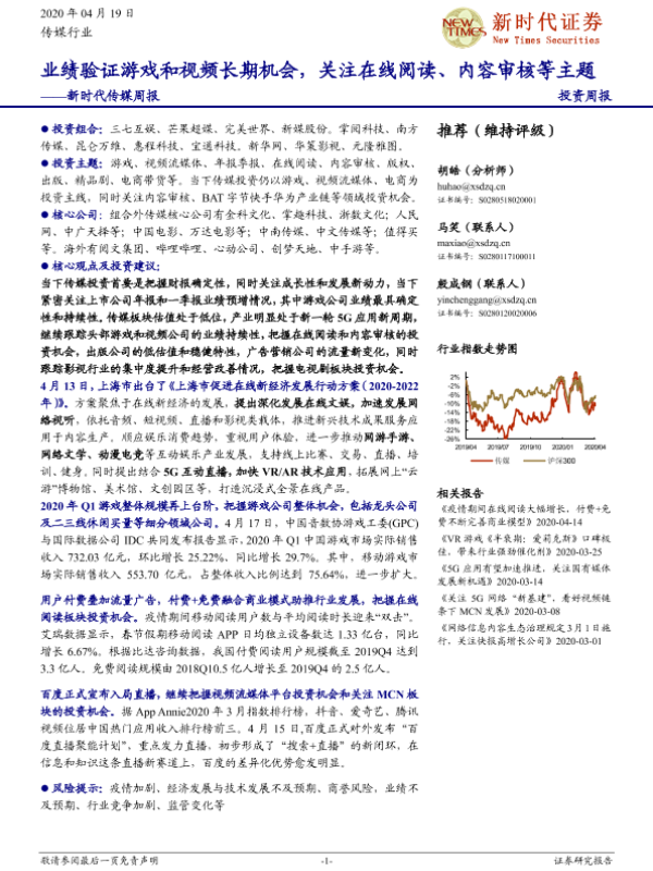 【新时代证券】【20200419】新时代传媒周报:业绩验证游戏和视频长期机会,关注在线阅读、内容审核等主题-41页