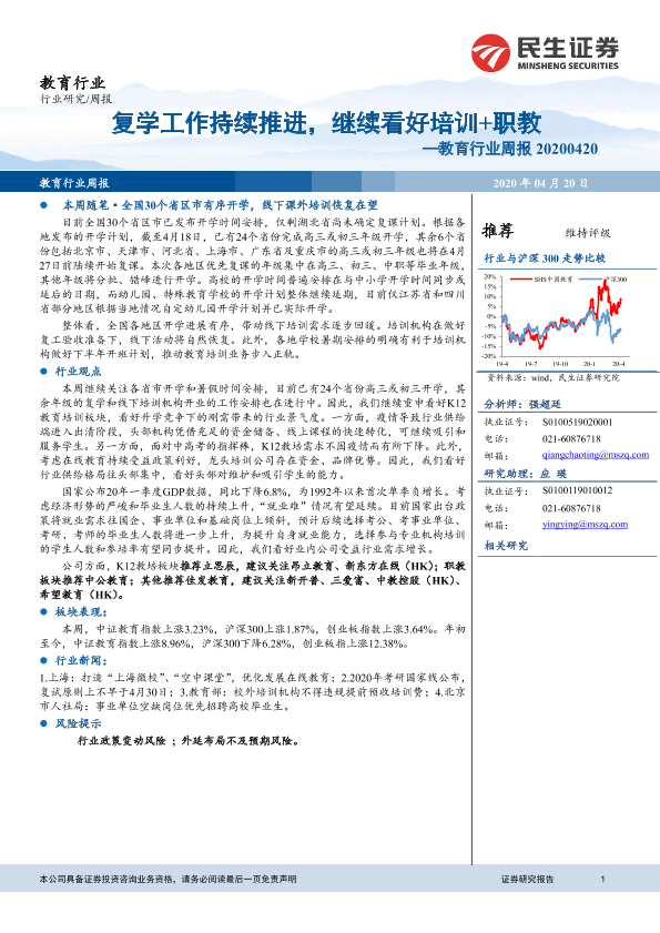 【民生证券】【20200420】教育行业周报:复学工作持续推进,继续看好培训+职教-14页