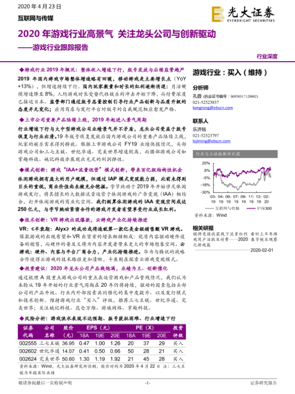 【光大证券】【20200423】2020年游戏行业高景气 关注龙头公司与创新驱动-28页
