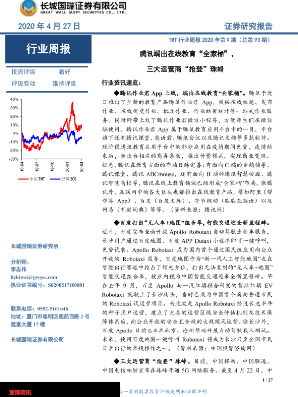 【长城国瑞证券】【20200427】TMT行业周报2020年第9期(总第93期):腾讯端出在线教育“全家桶”,三大运营商“抢登”珠峰-27页