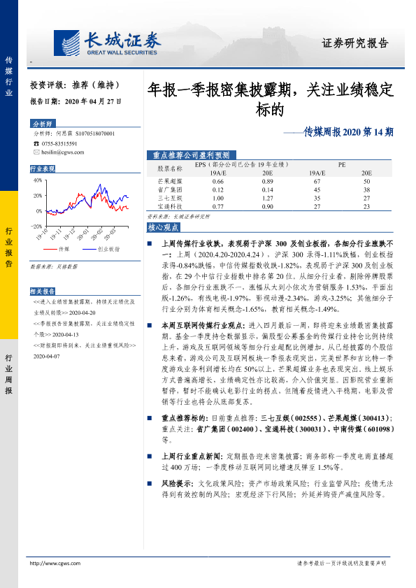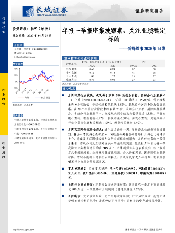 【长城证券】【20200427】传媒周报2020第14期:年报一季报密集披露期,关注业绩稳定标的-19页