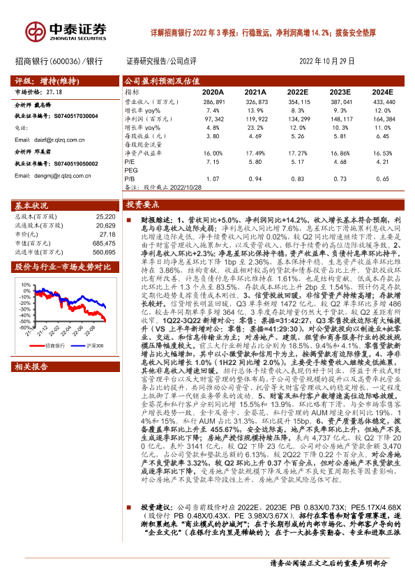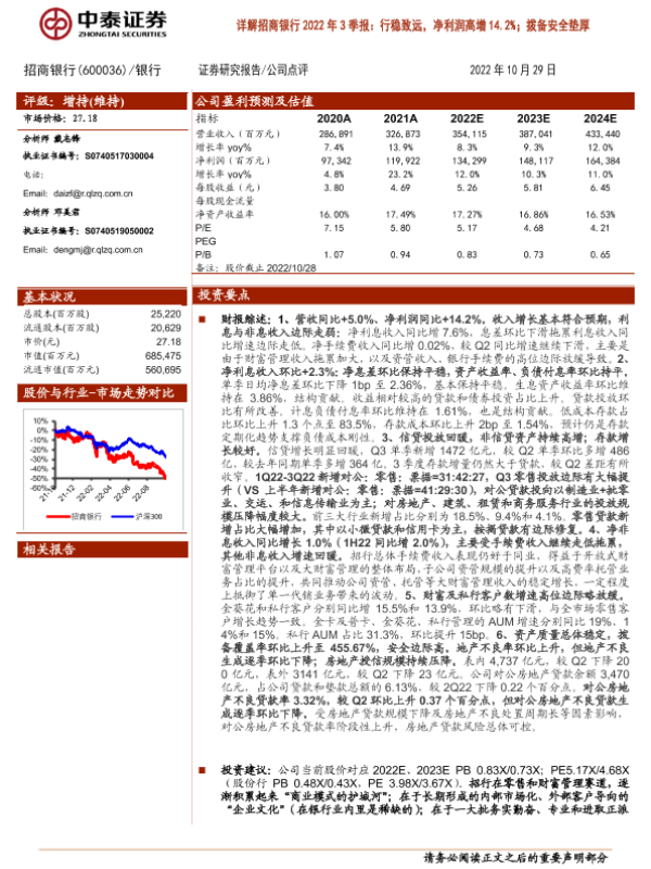 【中泰证券】【20221029】招商银行600036.SH详解招商银行2022年3季报:行稳致远,净利润高增14.2%;拨备安全垫厚-17页